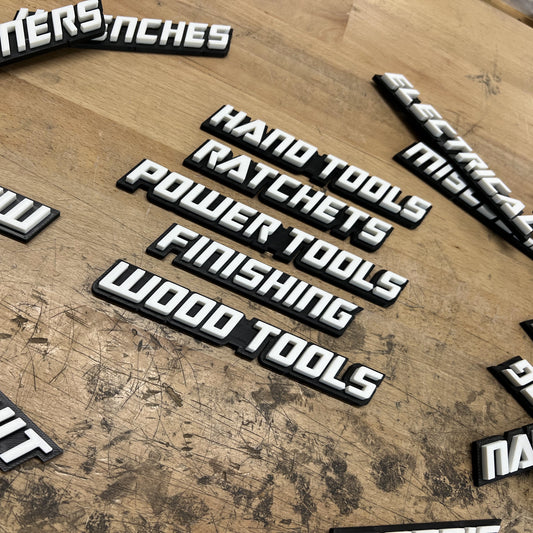 Emblèmes de tiroir de boîte à outils personnalisés - PERSONNALISÉ 5 - Tapez le vôtre - Police Sharp - Économie