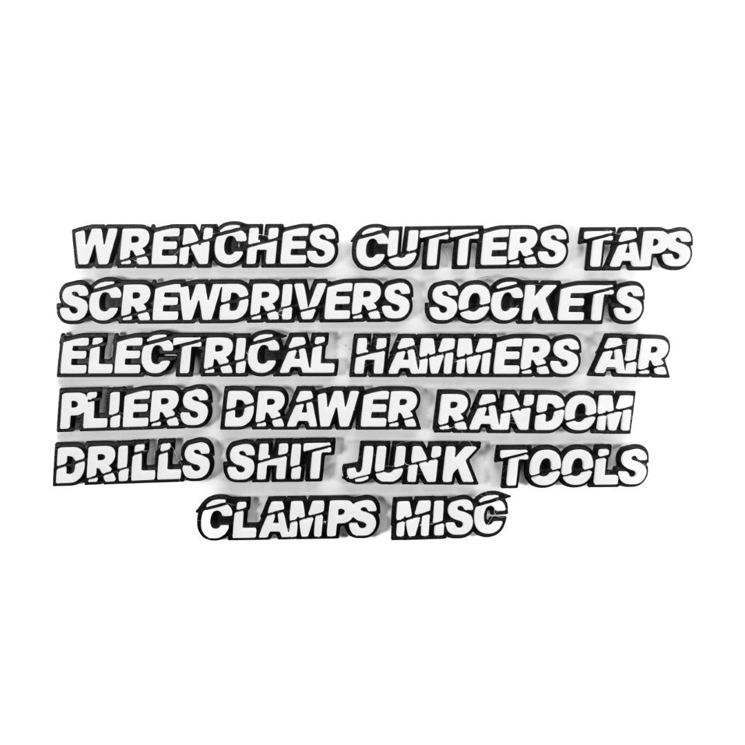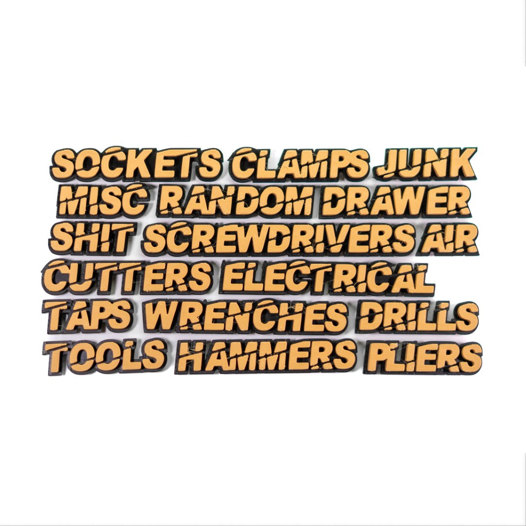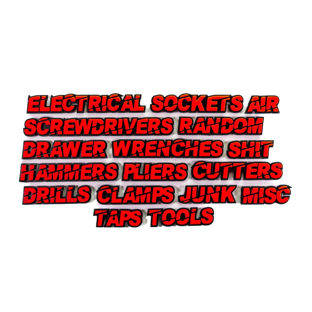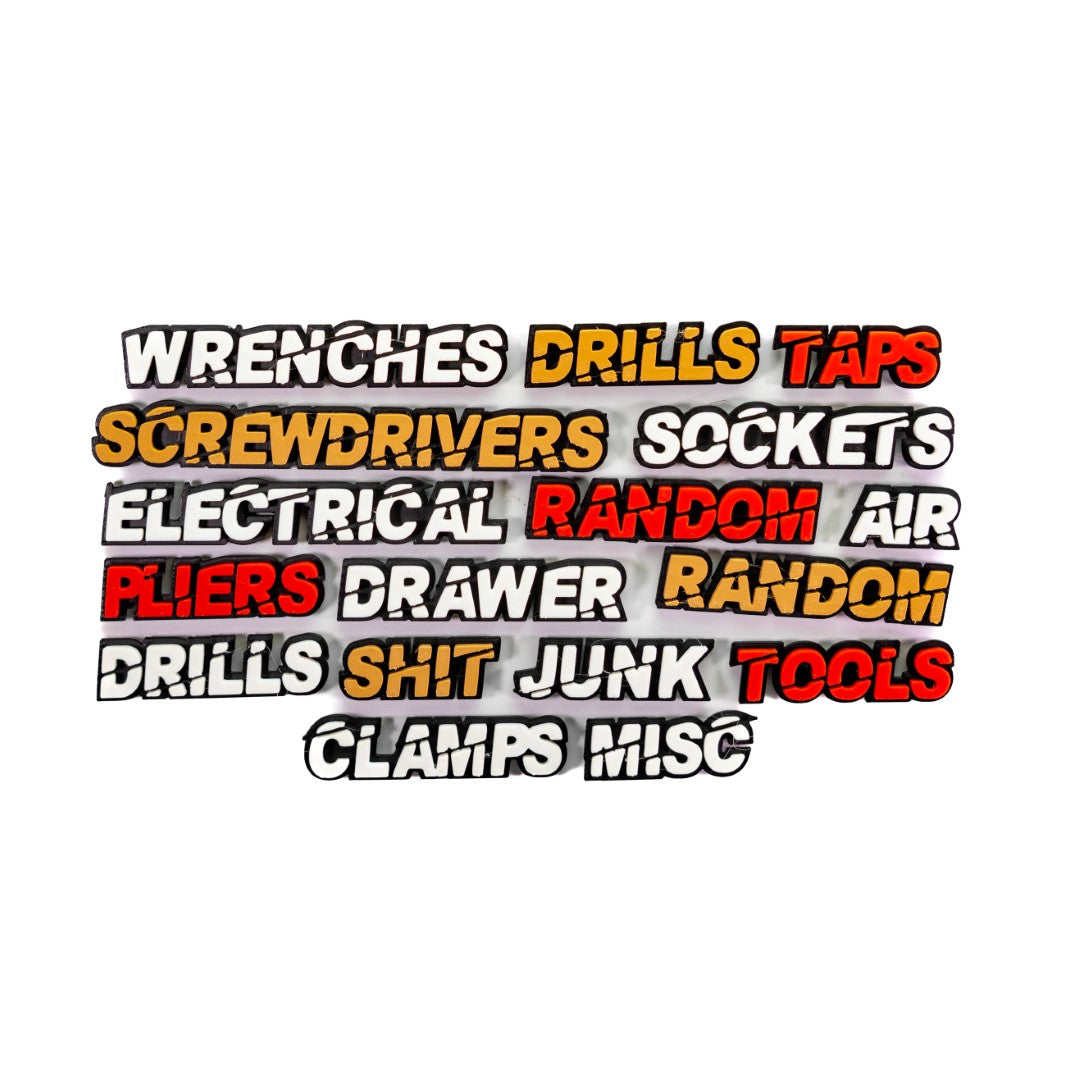 Étiquettes de tiroir de boîte à outils de qualité, fabriquées spécialement pour les boîtes à outils et l'utilisation en atelier. Ces emblèmes sont dotés d'un support magnétique ou adhésif solide, pour un remplacement et une réorganisation faciles de vos tiroirs de boîte à outils. Les 17 étiquettes présentées sur cette photo sont incluses lorsque vous achetez ce produit ! Ces étiquettes mesurent environ 0,75" de haut et varient en largeur.