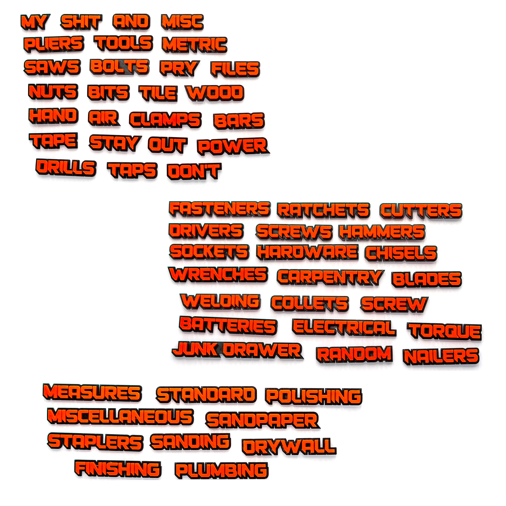 Introducing our MEGA set of Sharp Font Toolbox/Garage labels! These bold badges help label your drawers or cabinets without ruining the look of your shop.